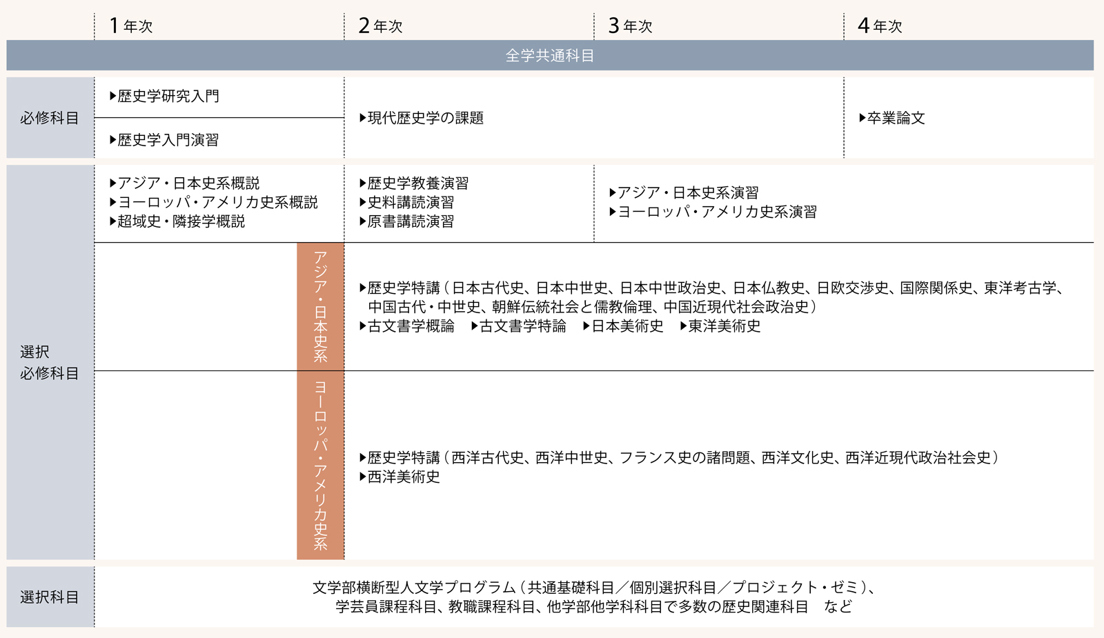 史学科の専門分野は、大きく「アジア・日本史系」と「ヨーロッパ・アメリカ史系」の2つに分かれ、それぞれが古代・中世・近世・近現代といった時代ごとに細分化されています。1年次には、これらの分野や超域史・隣接学に関する概説科目のほか、「歴史学研究入門」「歴史学入門演習」といった授業を通して、歴史研究の基礎を学びます。またこの時期は、幅広い分野に触れることで、自分の興味や関心を見つける期間でもあります。2年次には、地域・時代ごとのプレゼミ(「歴史学教養演習」や「講読演習」)や、必修科目の「現代歴史学の課題」を通じて、より専門的な学習方法を身につけます。3年次からは、ゼミ(演習)で担当教員の指導を受けながら、自ら設定したテーマについて調査・研究を進めます。そして4年次には、これまでの学びの集大成として卒業論文を作成します。