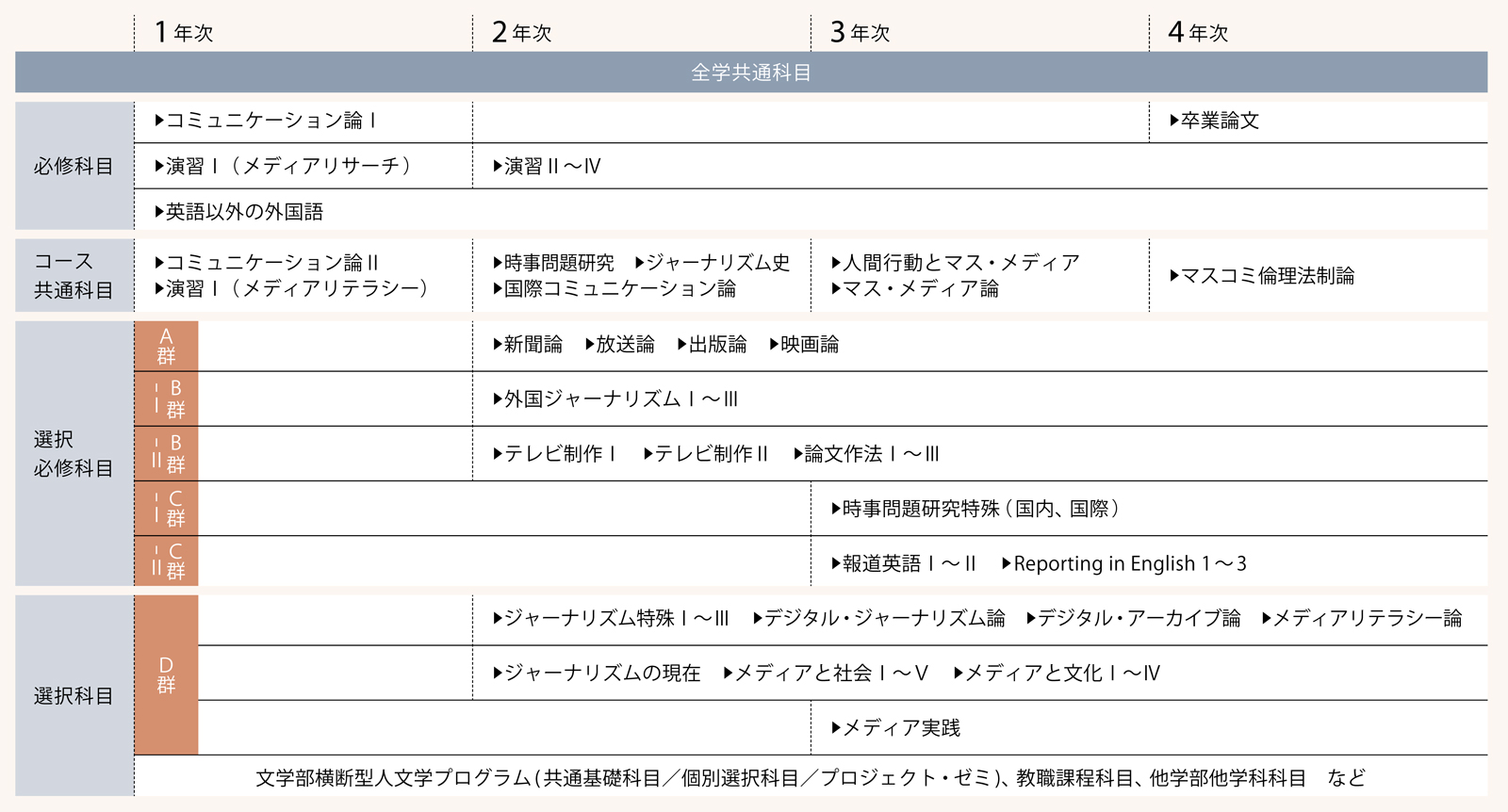 1年次はコミュニケーションの基本理論を身につけ、基礎的な資料調査やテレビ番組制作、メディアリテラシーに関する科目に取り組み、2年次以降は必修科目でジャーナリズム、マス・メディアの歴史や理論、国際コミュニケーション論などを学習します。またA~Dの4つの科目群のうち、A~C群の科目で新聞・放送・出版のあり方、海外のジャーナリズム、時事問題研究などを学び、D群でより実践的な学びを交えながら、より専門的な知識を深めます。