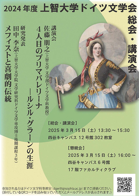 2024年度ドイツ文学会講演会・懇親会を以下の日程で開催します。懇親会に参加希望の方はドイツ文学科事務室dgerlit@sophia.ac.jpまで氏名を明記してお申し込みください。学部生の参加もお待ちしています。