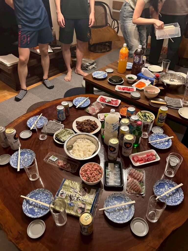 1日目は集合時間が午後であったことから、全員で食卓を囲ったのは晩御飯が最初になりました。晩御飯は港でとれた新鮮な海鮮をふんだんに使った手巻き寿司を食べました。みんなで作業を分担し、用意した手巻き寿司はひとしおに美味しく感じるものでした。また、少ししかなかったアジの刺身の譲り合いは3,4年生の距離を縮める良い出来事だったと思います。食後の酒盛りは盛り上がったと表現するにとどめておきます……(笑)。