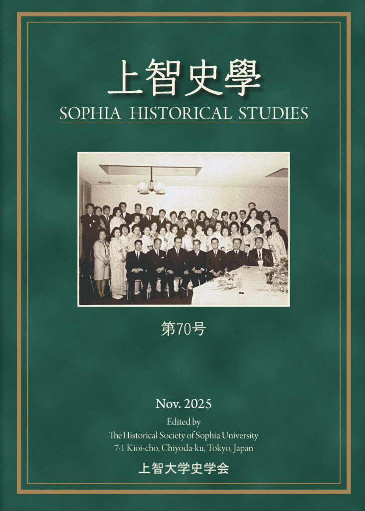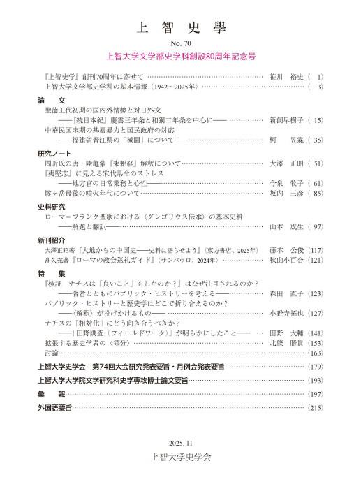 上智大学史学会の機関誌である『上智史学』の第70号が刊行されました。今号は通常の論文・研究ノートに加えて、「史学科創設80周年」の記事や大好評を博した昨年度の大会シンポジウムに基づく特集など盛り沢山です。ぜひ手に取ってご覧ください。