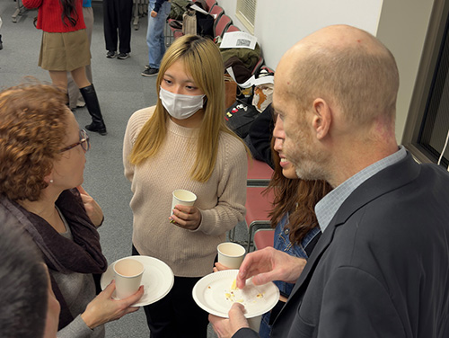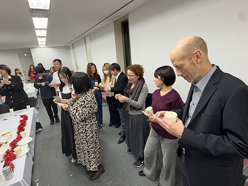 学科のヘルパーたちを中心に企画されたクリスマスパーティーに、1年生から4年生まで多くの学生が集まりました。ドイツ語の授業でネイティヴの先生と学んだクリスマスソングを皆で歌いながら、美味しいシュトレンや、ビンゴゲームも楽しみました。今年はなんと!Weihnachtsmann(サンタさん)も登場し、会場を盛り上げてくれました。