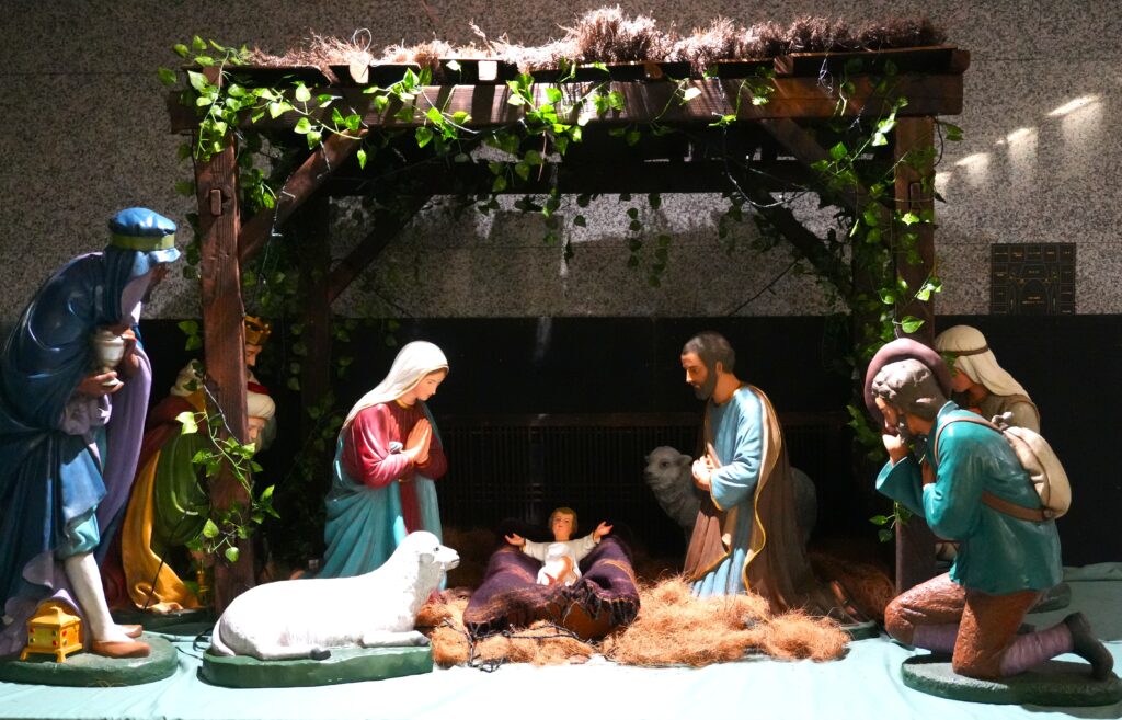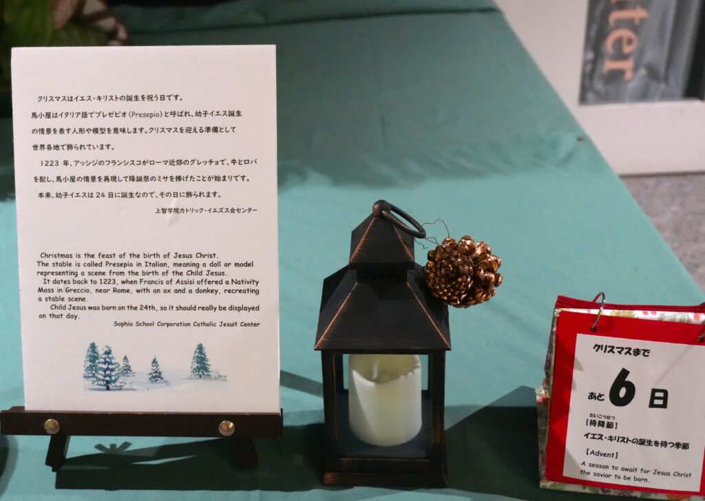 12月に入ると、2号館1階のカトリック・センターの前にキリスト降誕の場面を模したNativityの飾り付けが登場します。イエス・キリストの誕生日は12月25日ですが、今年は冬休み開始前の12月18日にBaby Jesusがお目見えしました。