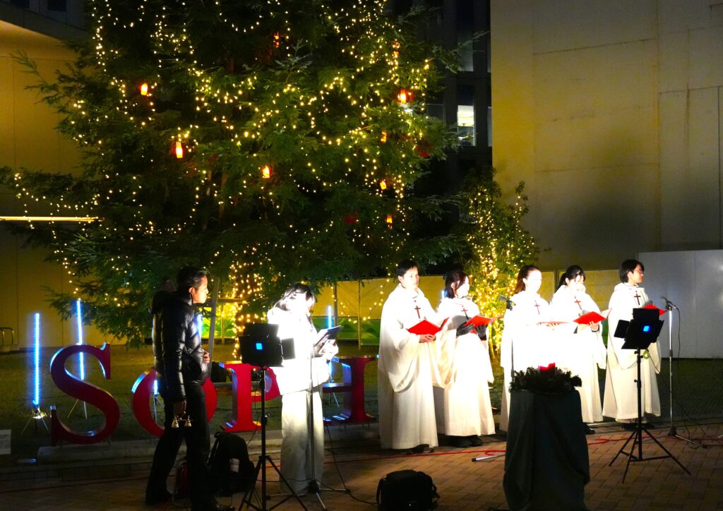 北門のクリスマス・ツリーの前で披露される聖歌に、帰宅途中の学生さんたちも足を止めて聴き入っていました。